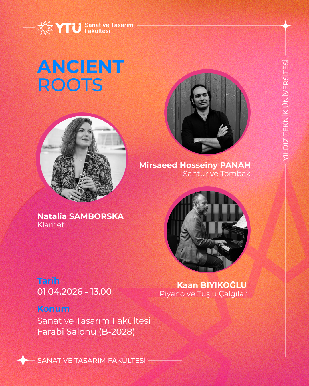 Ancient Roots, klarnetçi Natalia Samborska, santur ile tombak sanatçısı Mirsaeed Hosseiny Panah ve piyanist Kaan Bıyıkoğlu’nun bir araya gelmesiyle oluşan disiplinlerarası bir kolektiftir. Farklı coğrafyaların müzikal hafızasını buluşturan topluluk, köklerden beslenen ama sınır tanımayan bir ses evreni yaratır. Serbest doğaçlamalarla örülü müziklerinde folklorik izler, cazın özgür dili, minimalizmin tekrara dayalı hipnotik dokusu ve çağdaş klasik müziğin renkleri iç içe geçer. Doğu ile Batı, gelenek ile yenilik, yazılı olan ile anlık yaratım arasında kurdukları dengede her konser yinelenemeyecek bir anlatıya dönüşür. Ancient Roots, dinleyicisini yalnızca bir konsere değil; kültürlerarası bir diyaloga, kadim ezgilerin çağdaş bir ifadeyle yeniden hayat bulduğu güçlü ve şiirsel bir müzikal yolculuğa davet eder.